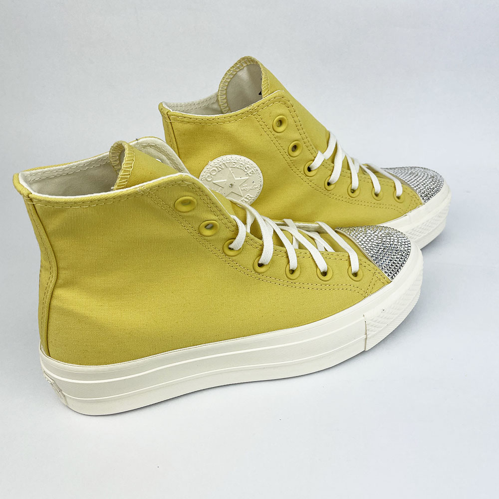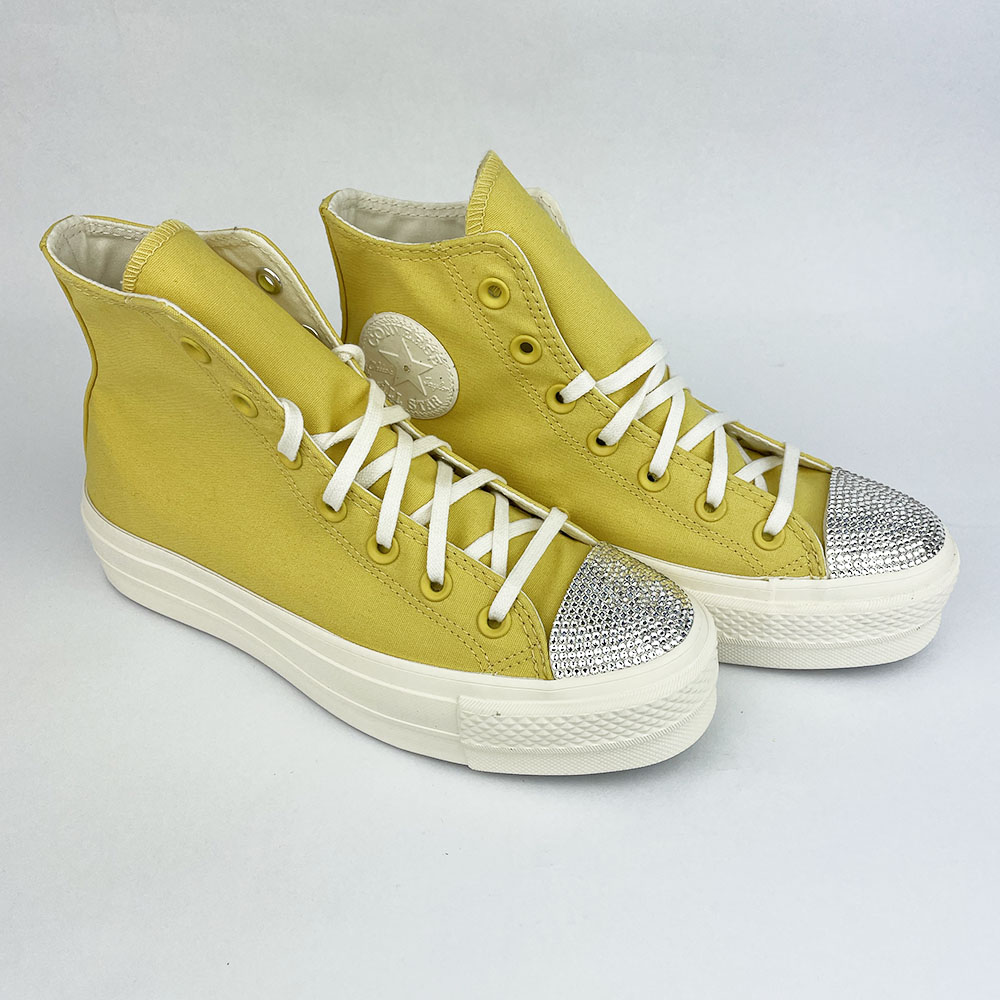Shoozers vám přináší originální a nepřehlédnutelné Converse Swarovski High Saturn Gold . Kombinace legendárních a pohodlných tenisek Converse v zajímavé zlatožluté barvě s krystaly Swarovski funguje dokonale. Silná platforma a střih po kotníky vás ochrání i před nepřízní počasí. Tenisky jsou mimo jiné vyrobeny z recyklovaného materiálu.